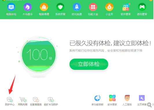 1. 進(jìn)入安全防護(hù)中心(不同的 360版本,安全防護(hù)中心的入口位置會(huì)不同)
